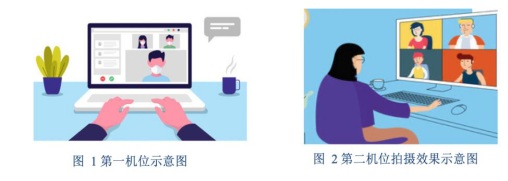 4.考生需要準備可以支撐“雙機位”運行的硬件,即需要兩部帶攝像頭的設(shè)備及附件,第一機位可以是電腦或手機,第二機位只能為手機(建議第一機位首選有線網(wǎng)+電腦)。復試開始后,考生需首先將第二機位的攝像頭360度環(huán)顧四周,以確保復試環(huán)境符合要求。一臺設(shè)備(第一機位)從正面拍攝,放置在距離本人30cm處,另一臺設(shè)備(第二機位)從考生側(cè)后方45°距離本人30cm處拍攝,確保第一機位和第二機位分別從考生面前和身后完整拍攝到考生全身,復試組考官能夠從第二機位清晰看到第一機位屏幕。效果圖如下: