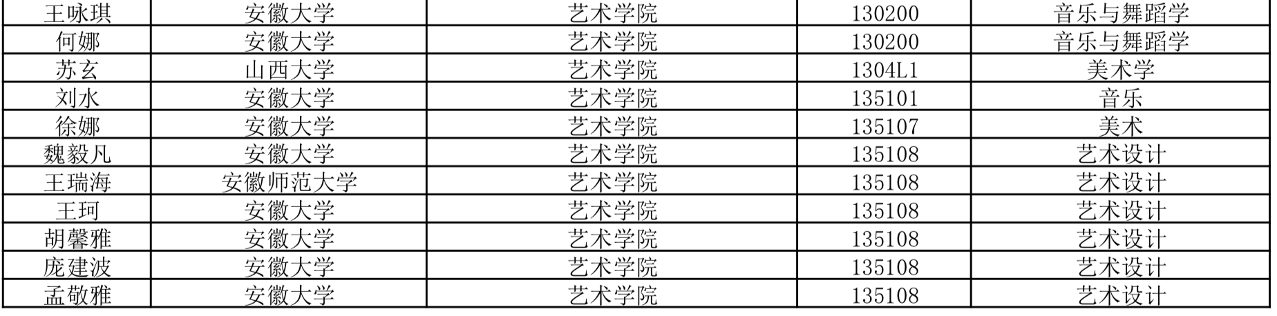 安徽大學(xué)藝術(shù)學(xué)院2021年保研錄取名單公示 發(fā)布時間:2020-10-26 安徽大學(xué)藝術(shù)學(xué)院2021年保研錄取名單公示 上一篇:安徽大學(xué)藝術(shù)學(xué)院2021年藝術(shù)設(shè)計考研招生目錄及參考書目 下一篇:安徽大學(xué)2021年考研初試成績查詢時間2月27日公布