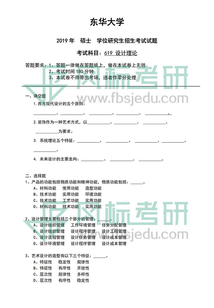 東華大學設計學、藝術設計考研2019年真題:619設計理論 發(fā)布時間:2019-09-07 上一篇:東華大學設計學、藝術設計考研2018年真題:619設計理論 下一篇:東華大學2021年考研初試成績查詢時間2月26日公布