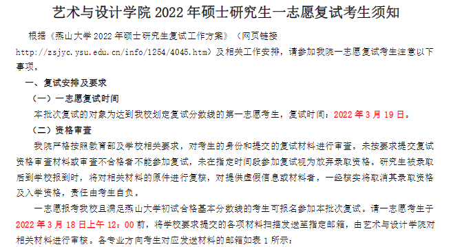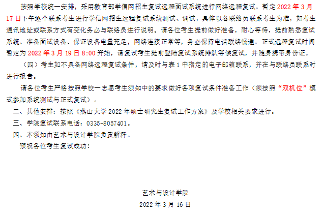 藝術(shù)與設(shè)計(jì)學(xué)院2022年考研碩士研究生一志愿復(fù)試考生須知 發(fā)布時(shí)間:2022-03-17 藝術(shù)與設(shè)計(jì)學(xué)院2022年考研碩士研究生一志愿復(fù)試考生須知 上一篇:燕山大學(xué)2022年考研復(fù)試工作方案 下一篇:燕山大學(xué)2022年考研一志愿復(fù)試名單公布