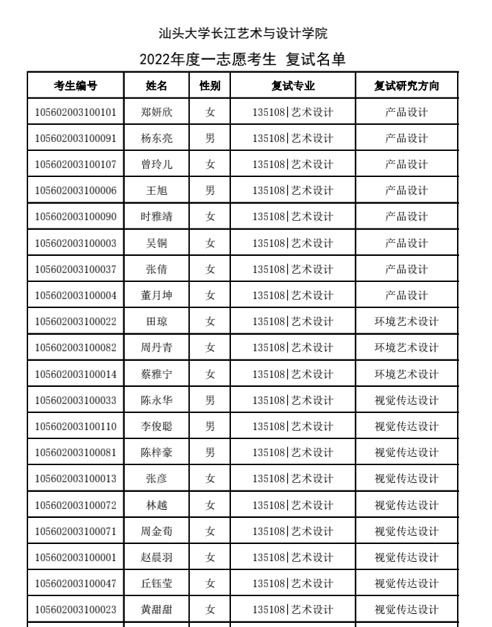 汕頭大學(xué)長(zhǎng)江藝術(shù)與設(shè)計(jì)學(xué)院2022年考研復(fù)試名單 發(fā)布時(shí)間:2022-03-25 汕頭大學(xué)長(zhǎng)江藝術(shù)與設(shè)計(jì)學(xué)院2022年考研復(fù)試名單 上一篇:汕頭大學(xué)長(zhǎng)江藝術(shù)與設(shè)計(jì)學(xué)院2022年考研復(fù)試分?jǐn)?shù)線及復(fù)試通知 下一篇:汕頭大學(xué)藝術(shù)設(shè)計(jì)學(xué)院2022年考研錄取名單