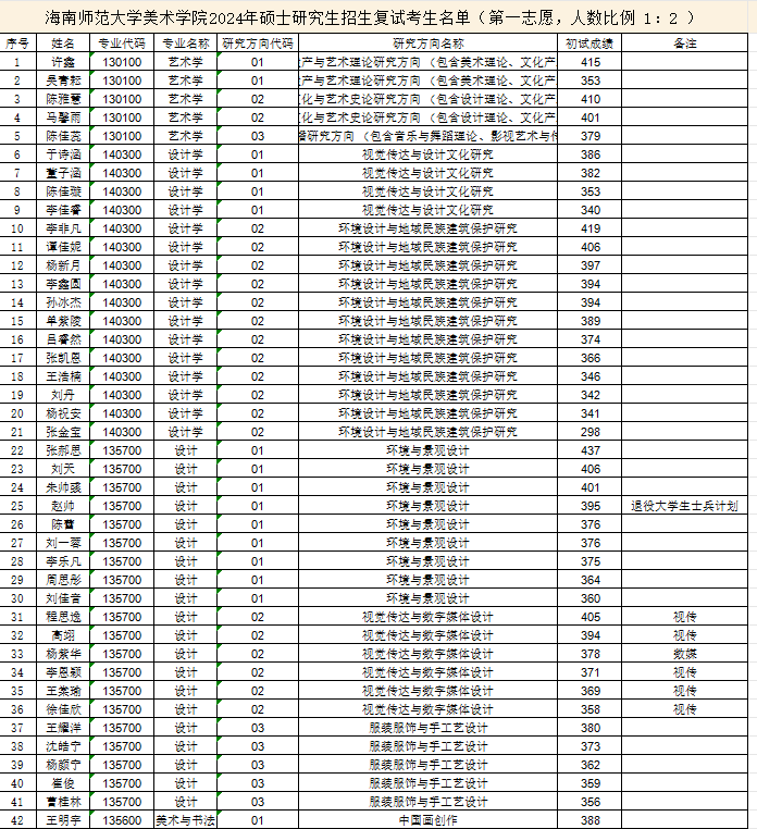 海南師范大學美術學院2024年考研復試名單 發(fā)布時間:2024-03-31 海南師范大學美術學院2024年考研復試名單 上一篇:海南師范大學美術學院2024年考研復試分數線及招生人數 下一篇:海南師范大學美術學院2024年考研錄取名單(一志愿)