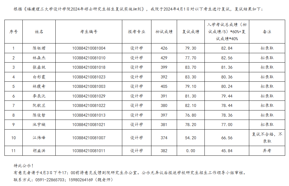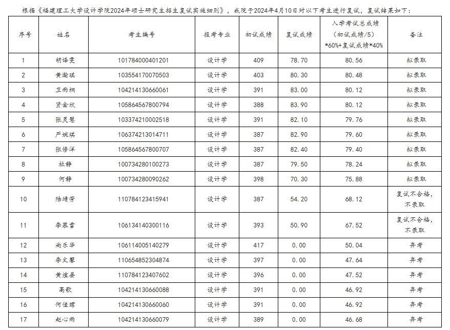 福建理工大學(xué)設(shè)計(jì)學(xué)院2024年考研復(fù)試錄取名單(一志愿+調(diào)劑)