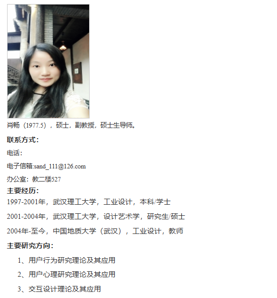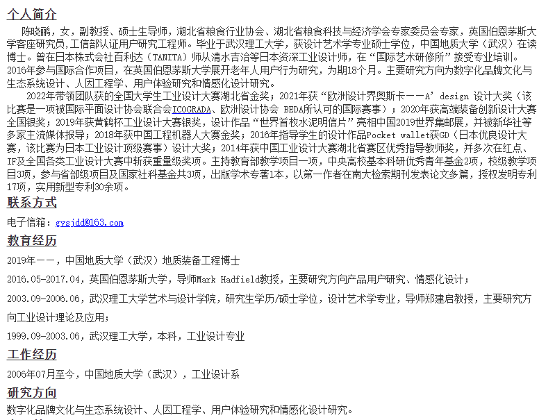 中國地質(zhì)大學(xué)(武漢)工業(yè)設(shè)計導(dǎo)師簡介 發(fā)布時間:2024-09-01 中國地質(zhì)大學(xué)(武漢)工業(yè)設(shè)計導(dǎo)師簡介 上一篇:中國地質(zhì)大學(xué)(武漢)機械與電子信息學(xué)院 2025年設(shè)計學(xué)保研招生人數(shù) 下一篇:中國地質(zhì)大學(xué)(武漢)藝術(shù)與傳媒學(xué)院2025年保研面試成績公示