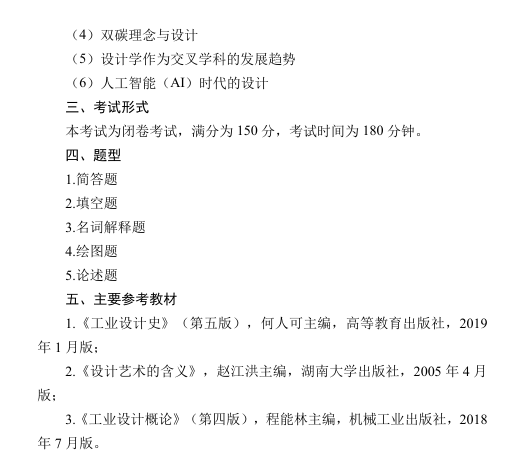 湖南大學(xué)設(shè)計與藝術(shù)學(xué)院2026年考研參考書有變化:702設(shè)計史論 發(fā)布時間:2025-07-08 參考書目:1.《工業(yè)設(shè)計史》(第五版),何人可主編,高等教育出版社,2019 年1月版; 2.《設(shè)計藝術(shù)的含義》,趙江洪主編,湖南大學(xué)出版社,2005年4月 版; 3.《工業(yè)設(shè)計概論》(第四版),程能林主編,機(jī)械工業(yè)出版社,2018 年7月版考試大綱: 上一篇:湖南大學(xué)工業(yè)設(shè)計考研2016-2025年真題匯總:819專業(yè)設(shè)計 下一篇:沒有了