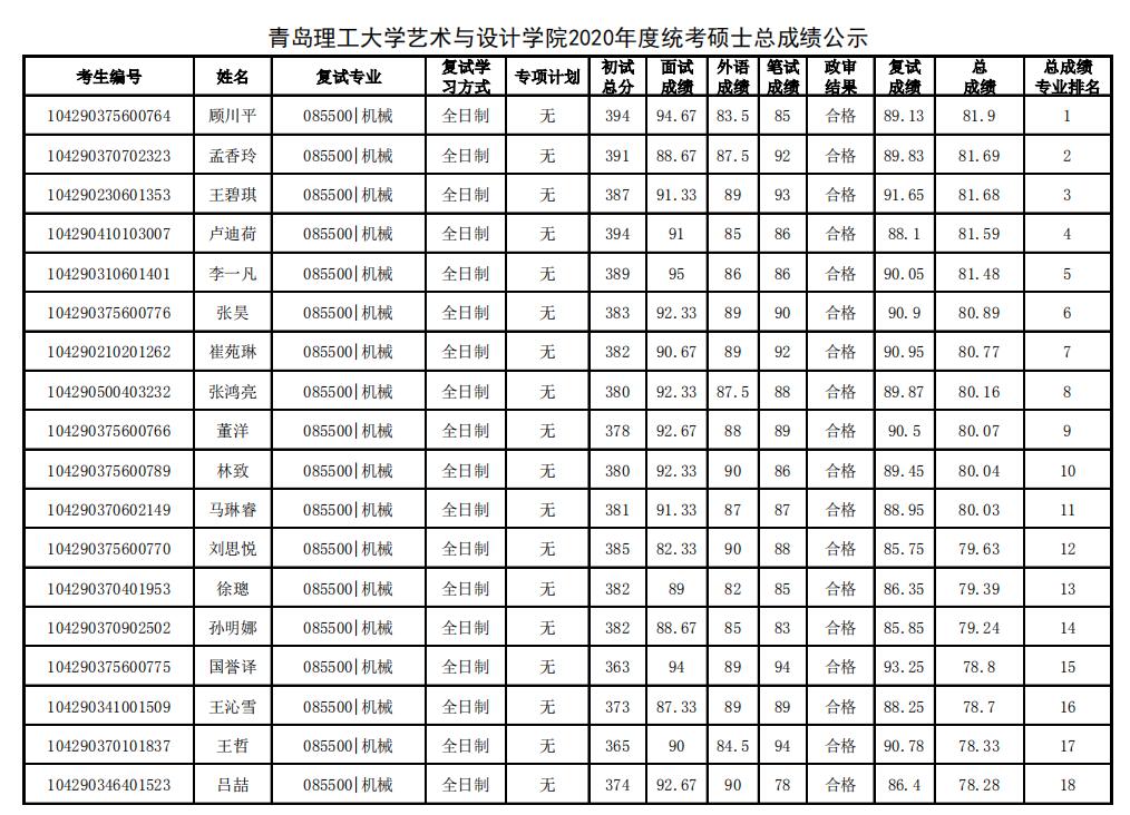 青島理工大學(xué)藝術(shù)設(shè)計(jì)學(xué)院2020年考研復(fù)試成績(jī)公示