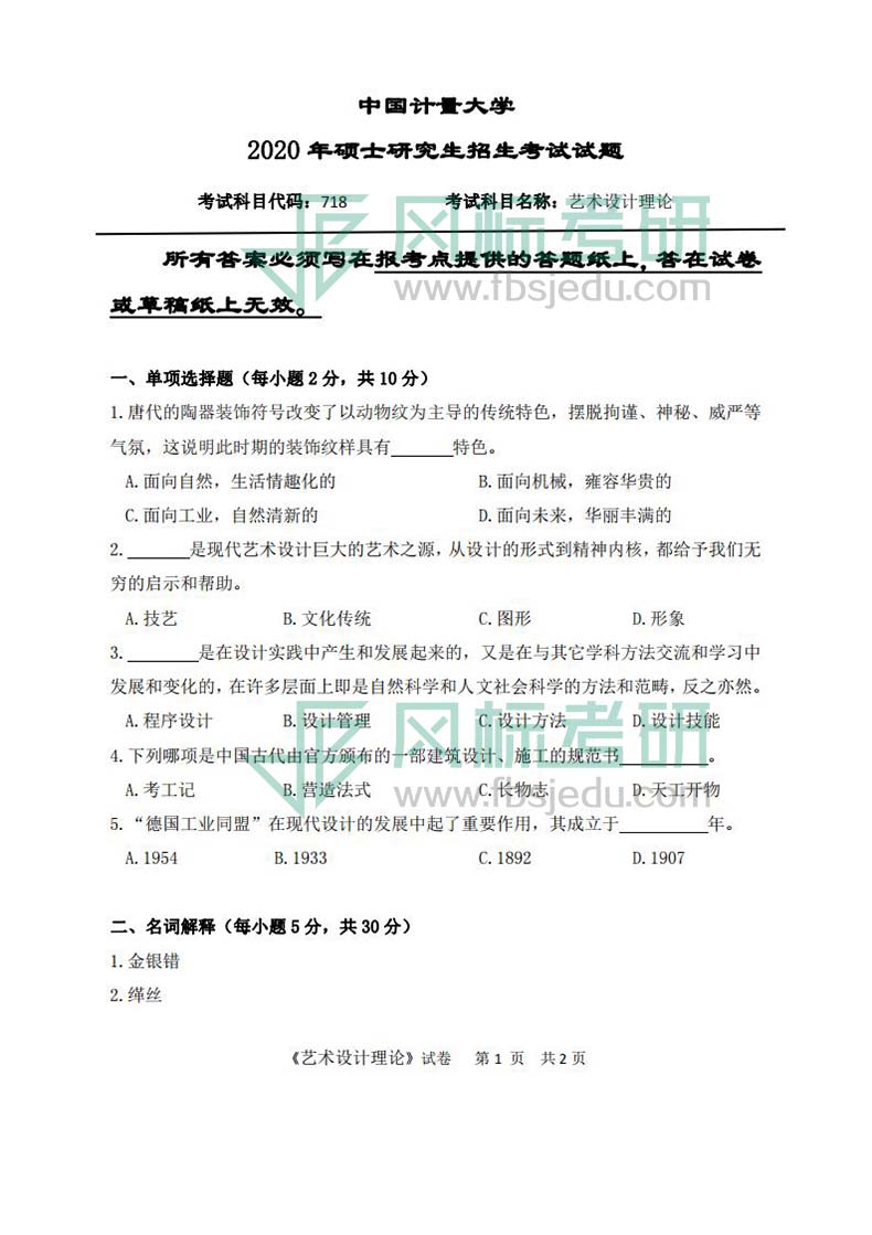 中國計(jì)量大學(xué)藝術(shù)與傳媒學(xué)院2020年考研真題:718藝術(shù)設(shè)計(jì)理論