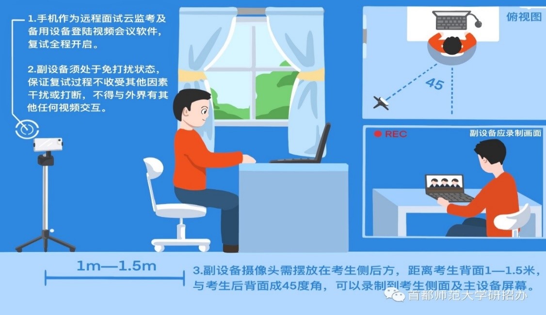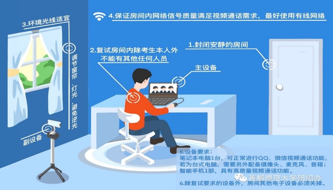 1.考生需要在安靜、明亮的房間獨(dú)立進(jìn)行遠(yuǎn)程面試,房間內(nèi)除考生本人不能有其他人員。周圍環(huán)境不得對(duì)復(fù)試產(chǎn)生干擾。視頻背景必須為真實(shí)環(huán)境。