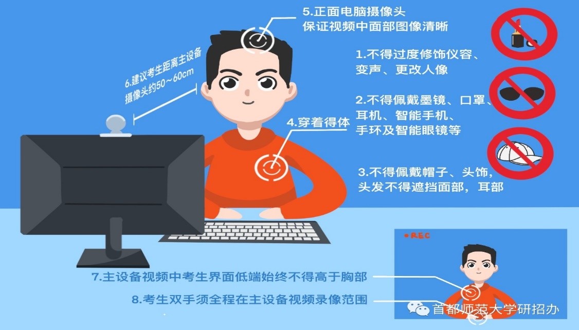 4.考生復(fù)試時(shí)正向面對(duì)第一機(jī)位,保證頭肩部及雙手出現(xiàn)在視頻畫(huà)面中,保證面部清晰可見(jiàn),頭發(fā)不得遮擋面部、耳部,不得佩戴帽子、耳飾、口罩、耳機(jī)、智能手表、手環(huán)及智能眼鏡等。第二機(jī)位須保證視頻呈現(xiàn)考生腰部及以上部位和第一機(jī)位的屏幕圖像。