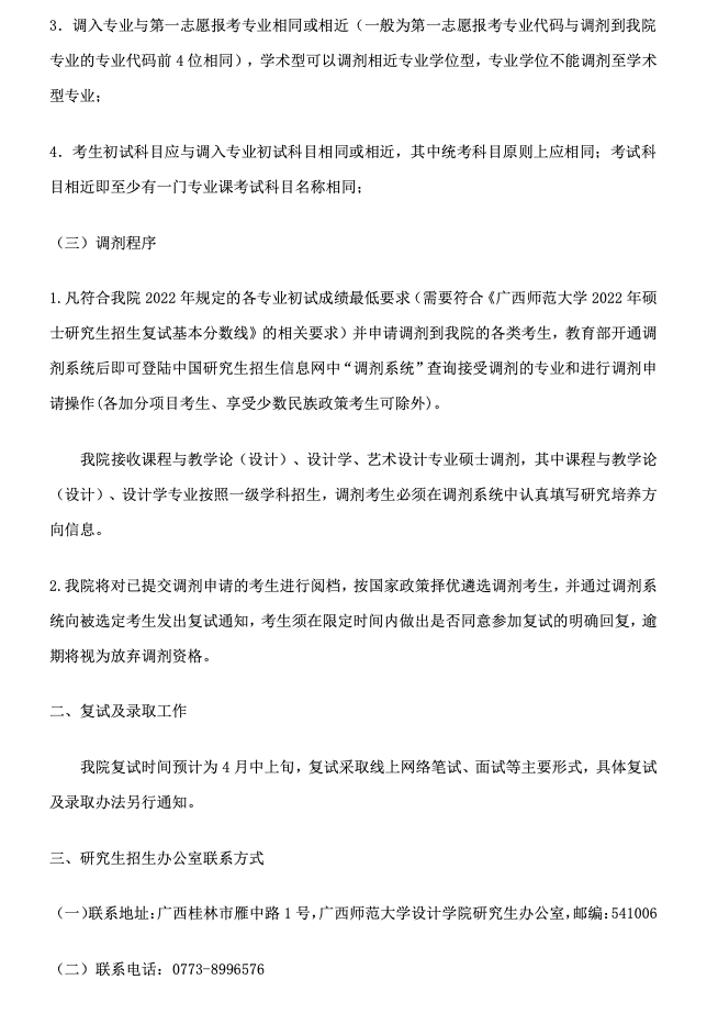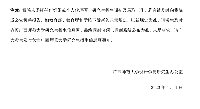 廣西師范大學設計學院2022年考研調劑信息 發(fā)布時間:2022-04-01 廣西師范大學設計學院2022年考研調劑信息 上一篇:廣西師范大學設計學院2022年一志愿復試安排與工作細則 下一篇:廣西師范大學設計學院2022年考研錄取名單