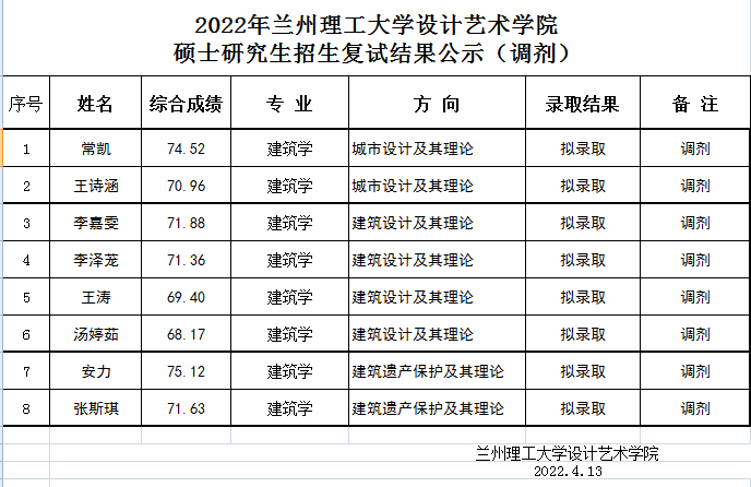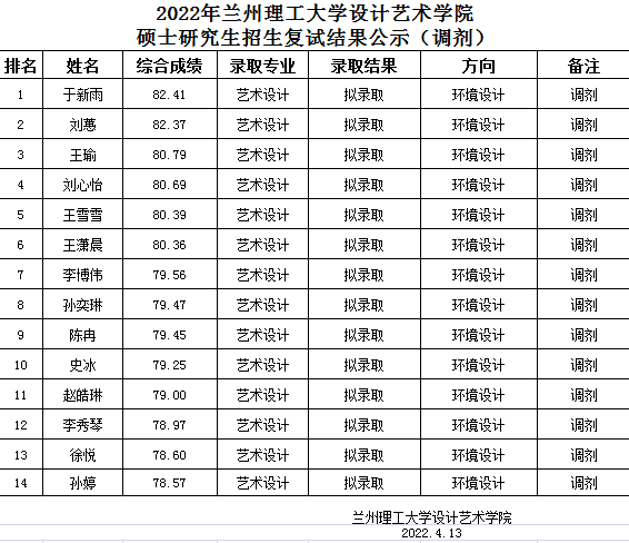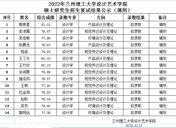 蘭州理工大學設計藝術學院2022年考研調劑錄取名單 發(fā)布時間:2022-04-14 蘭州理工大學設計藝術學院2022年考研調劑錄取名單 上一篇:蘭州理工大學設計藝術學院2022年考研錄取名單(一志愿) 下一篇:蘭州理工大學設計藝術學院2022年優(yōu)秀大學生暑期學術夏令營(報名截止7月10日)