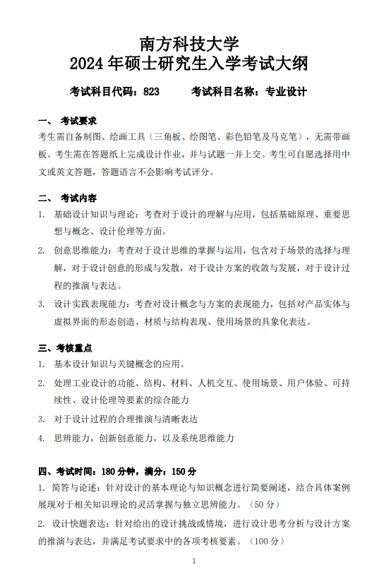 南方科技大學(xué)2024年工業(yè)設(shè)計(jì)工程考研考試大綱:823專(zhuān)業(yè)設(shè)計(jì) 發(fā)布時(shí)間:2023-09-18 南方科技大學(xué)2024年工業(yè)設(shè)計(jì)工程考研考試大綱:823專(zhuān)業(yè)設(shè)計(jì) 上一篇:南方科技大學(xué)2024年工業(yè)設(shè)計(jì)工程考研招生目錄 下一篇:南方科技大學(xué)2024年工業(yè)設(shè)計(jì)工程保研錄取名單