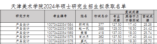 天津美術(shù)學院設(shè)計藝術(shù)學院2024年產(chǎn)品設(shè)計考研復(fù)試錄取名單