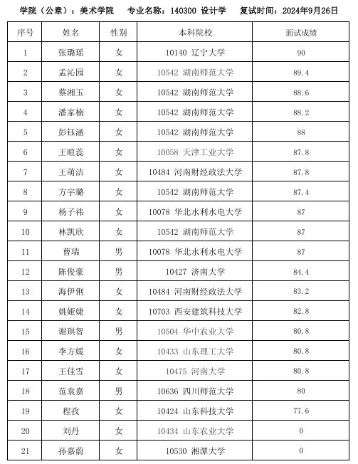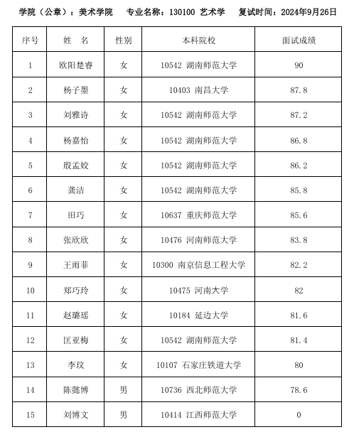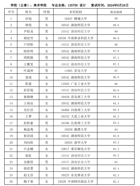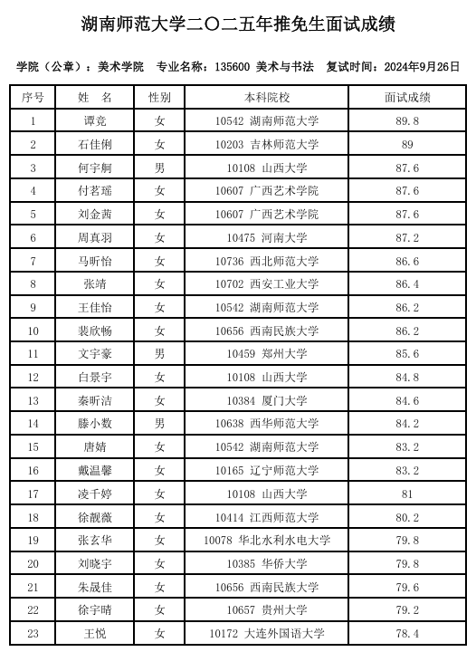 湖南師范大學(xué)美術(shù)學(xué)院2025年保研面試成績(jī)公示