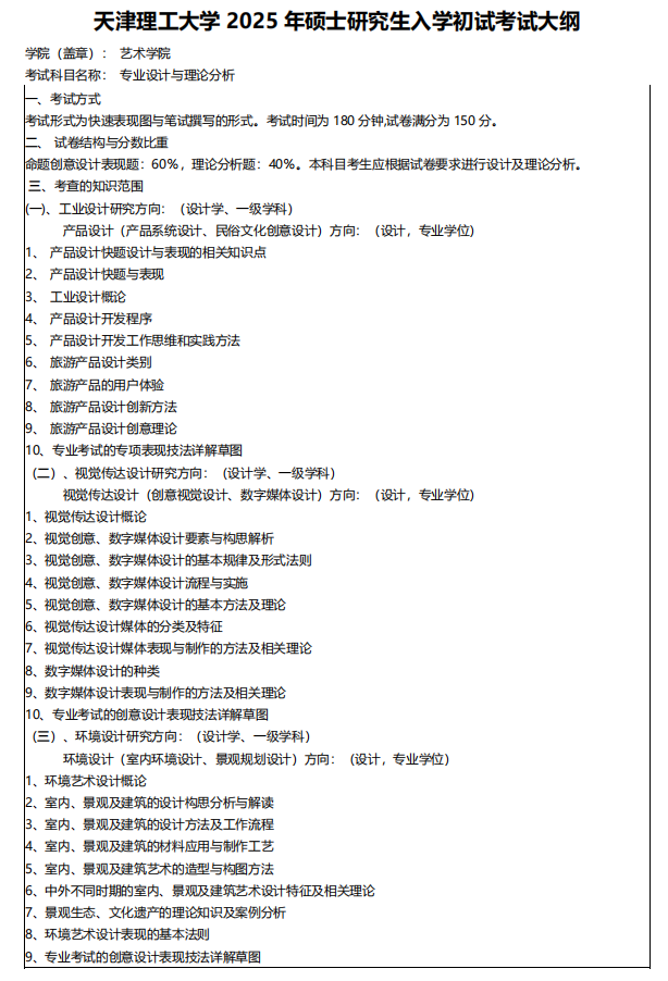 天津理工大學(xué)藝術(shù)學(xué)院2025年考研考試大綱:910專業(yè)設(shè)計與理論分析 發(fā)布時間:2024-10-06 天津理工大學(xué)藝術(shù)學(xué)院2025年考研考試大綱:910專業(yè)設(shè)計與理論分析 上一篇:天津理工大學(xué)藝術(shù)學(xué)院2025年考研考試大綱:618設(shè)計史及其理論 下一篇:天津理工大學(xué)藝術(shù)學(xué)院2025年保研錄取名單